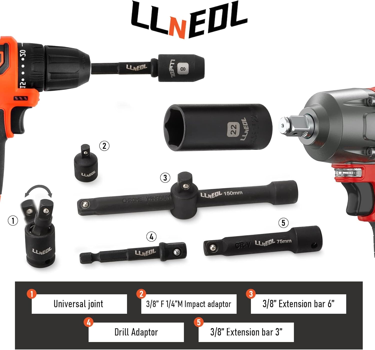| Included Components | 1x 3/8" F*1/4"M Adapter;, 1x 3/8” 72T Ratchet; 1x 3/8" U-Joint, 28x METRIC (Deep/Shallow): 8, 9, 10, 11, 12, 13, 14, 15, 16, 17, 18, 19, 21, 22mm; 16x SAE (Deep/Shallow): 5/16, 3/8, 7/16, 1/2, 9/16, 5/8, 11/16, 3/4”, 2x 3/8” Extension Bars: 3, 6”, 2x SAE Spark Plug Sockets: 13/16, 5/8" |