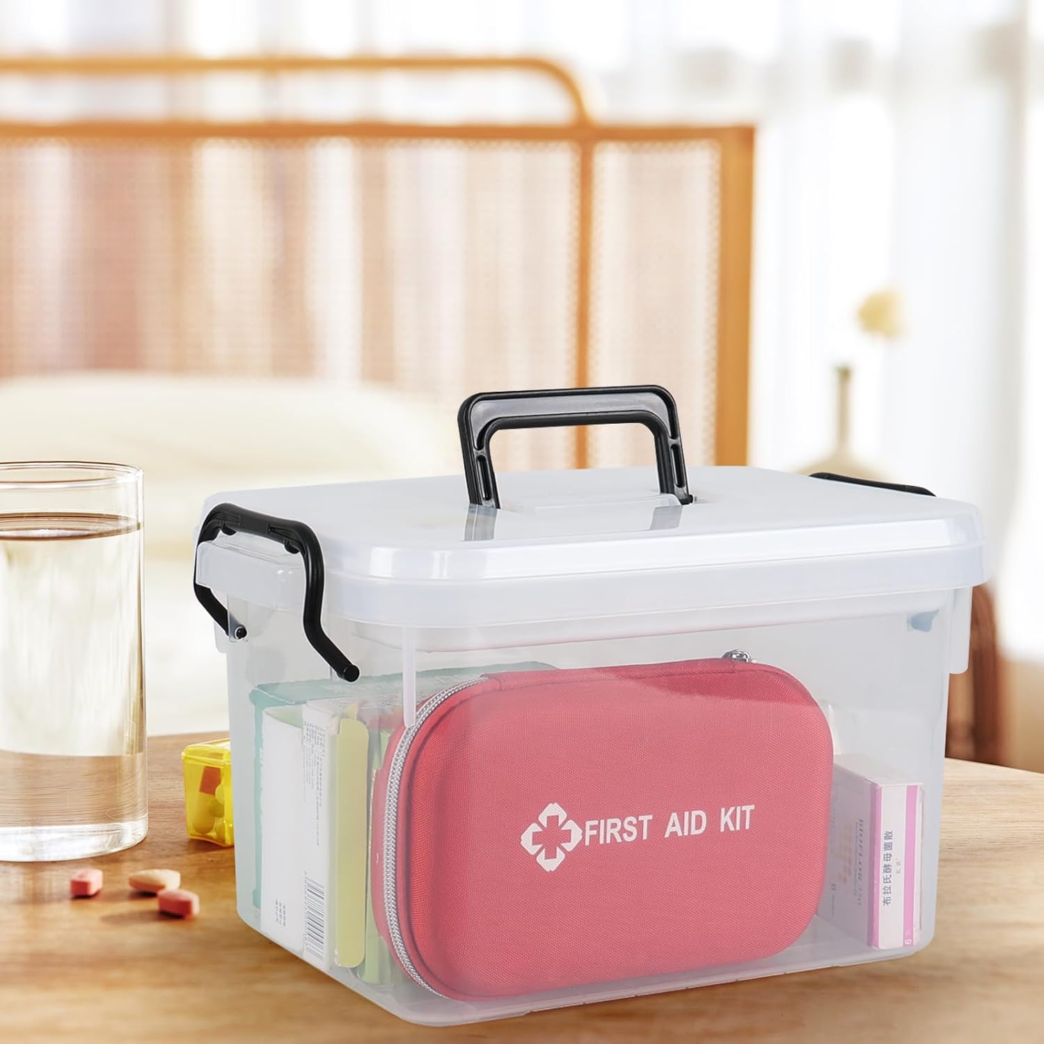 Plastic clear family first aid organizer box.