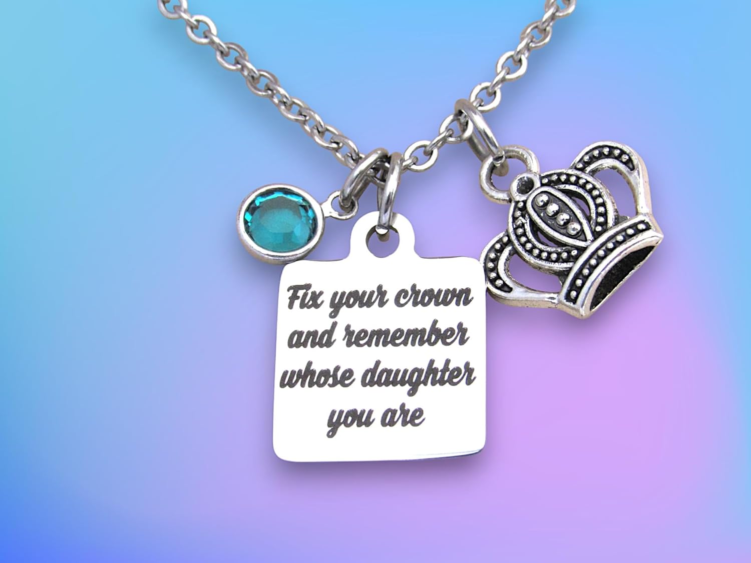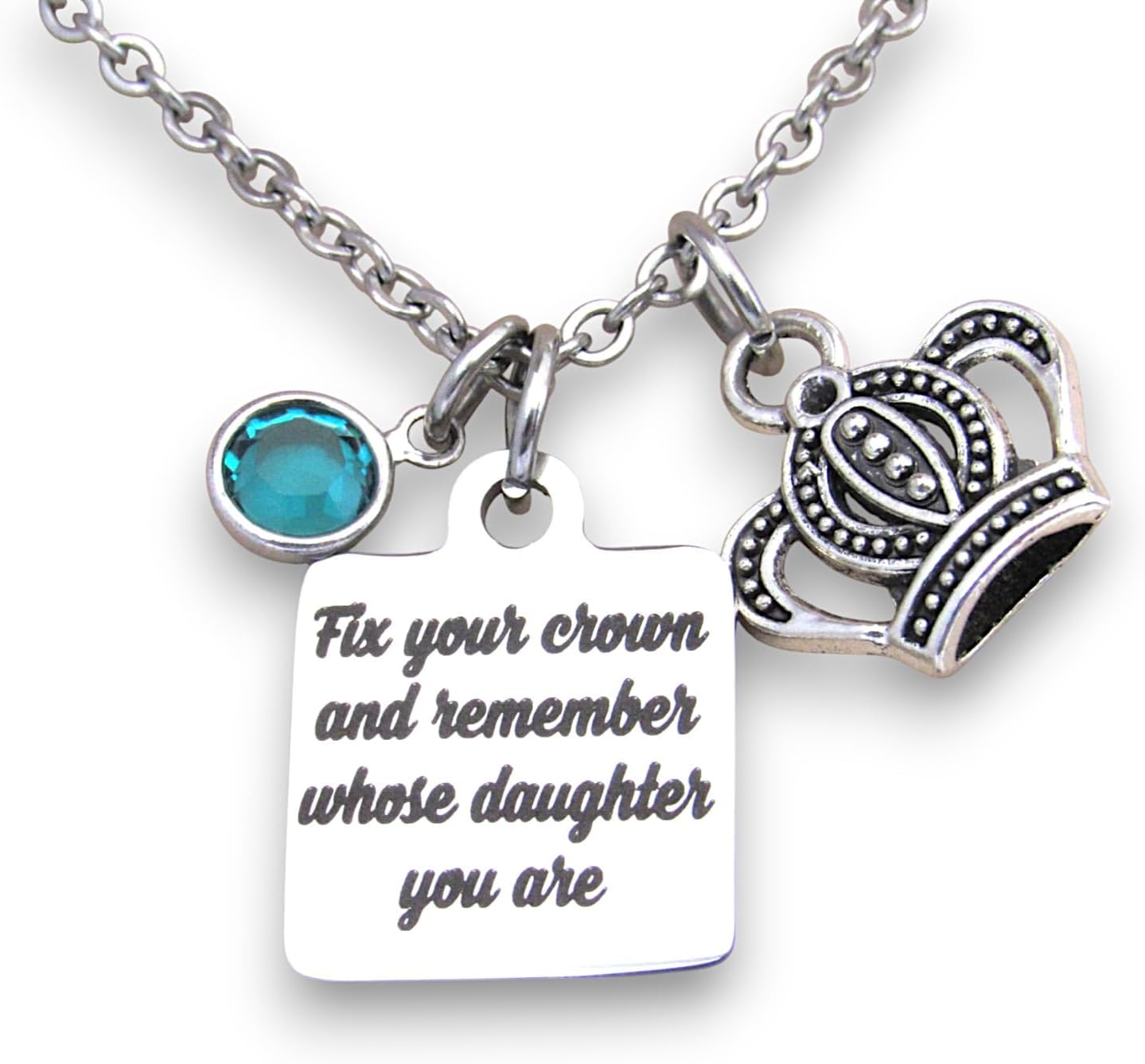 Beautiful "Fix your crown and remember whose daughter you are" laser engraved charm necklace. Crystal birthstone and silver princess crown charm dangle alongside the laser engraved stainless steel charm. The stainless steel charm is 19mm, which is about the size of a penny. The chain is stainless steel with a lobster clasp. Please choose what color crystal and what length you would like the chain. All jewelry items come in a little black box ready to gift. Why choose stainless steel jewelry? * hypoallergenic * resists staining and tarnishing * easy to care for * sturdy and beautiful. Checkout my shop for more unique handmade items. All of my items are handcrafted by me in Myrtle Beach, SC. My products make wonderful gifts and are affordable. Items are designed by me and printed from my laser or hand stamped. Custom orders are welcome. Leave me a message if you have any questions and I will get back to you as soon as possible. Thank you for supporting my small business! Take care.