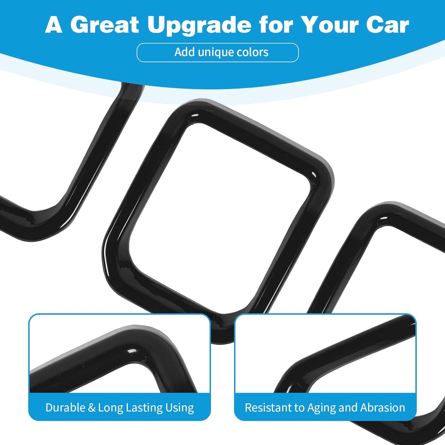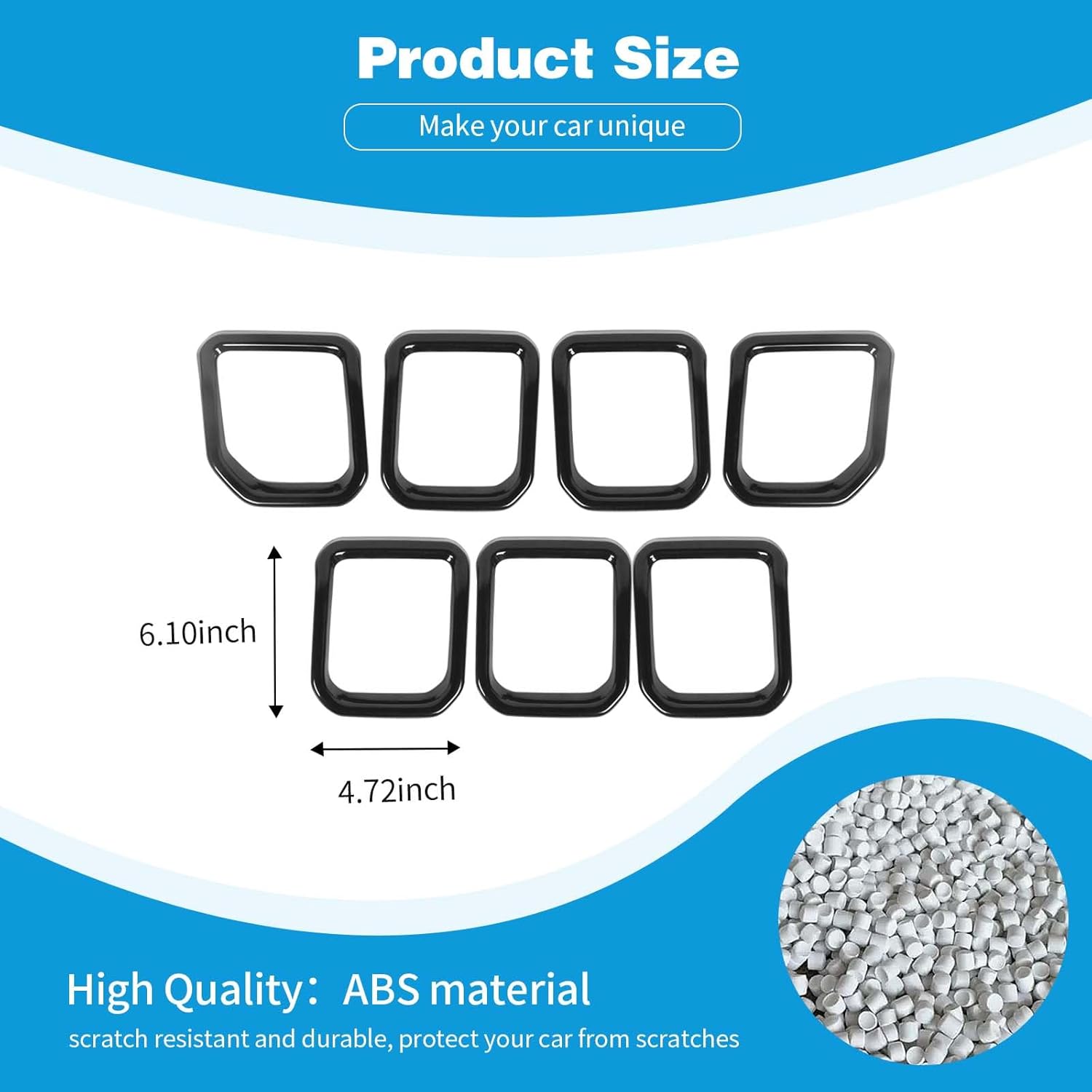 Fitment: Front grill frame covers compatible with Jeep Compass 2021 2022 2023. Material: ABS with glossy surface. Package Includes: 7pcs frame cover trim. Install: 1. Clean the corresponding grill area before installation and make sure that there is no dust, oil, wax. 2. When the temperature is below 50°F, be sure to heat the double-sided tape that comes with the product to achieve a better sticking effect. 3. Before removing the back protective film of the double-sided tape, press down on each tape to make sure it makes good contact. 4. Installing: First, tear off a corner of the protective film on the back, and then adjust the position of the product accurately, and then slowly tear off the film and press it. 5. Within 48 hours after the installation of the product (the position where the glue is attached), it should not be in contact with water, oil, or large dust. Note: Please compare the pictures and compatibility before buying to confirm whether it is suitable for your model.